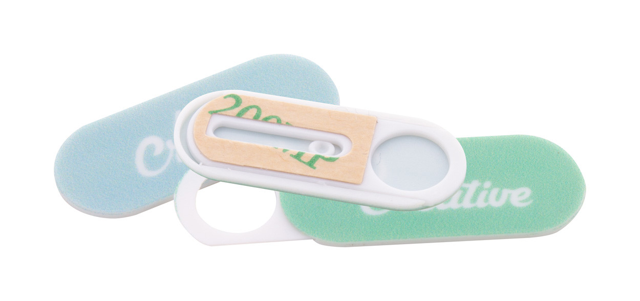 Custom, full colour printed plastic, anti spy webcam blocker with sliding cover and adhesive back. With all over digital printed paper booklet. Price includes digital and UV LED printing. MOQ: 100 pcs.