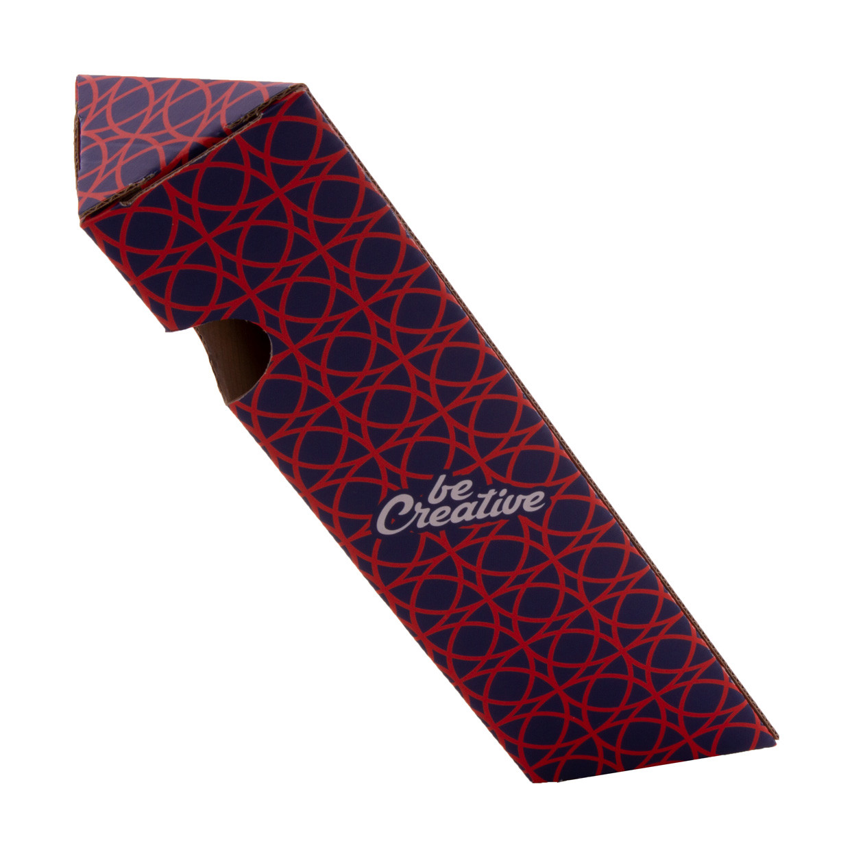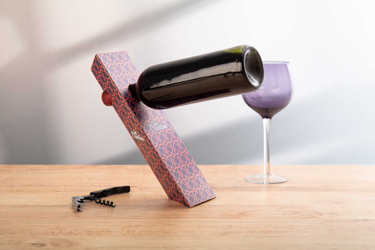 Custom made, full colour printed corrugated cardboard gravitational wine bottle holder. Delivered flat-packed. MOQ: 50 pcs.
