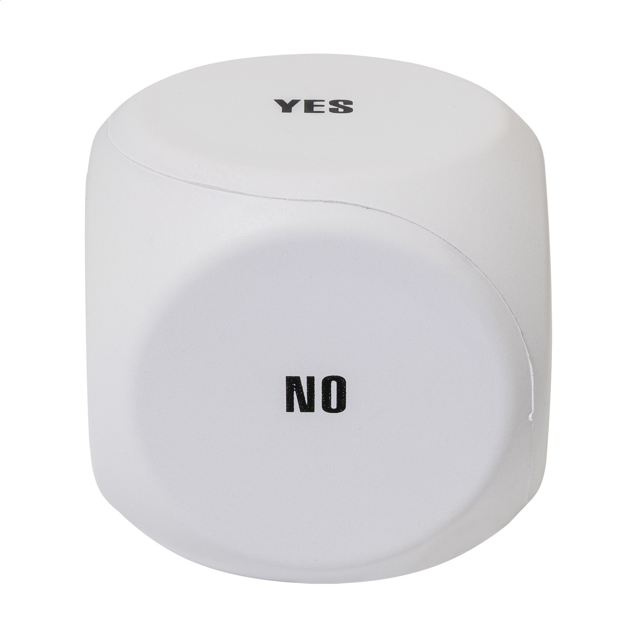 Dice shaped, decision maker antistress ball in PU foam. Including the following messages: Take a break, Tomorrow, Maybe, Yes, No and a blank side for printing.