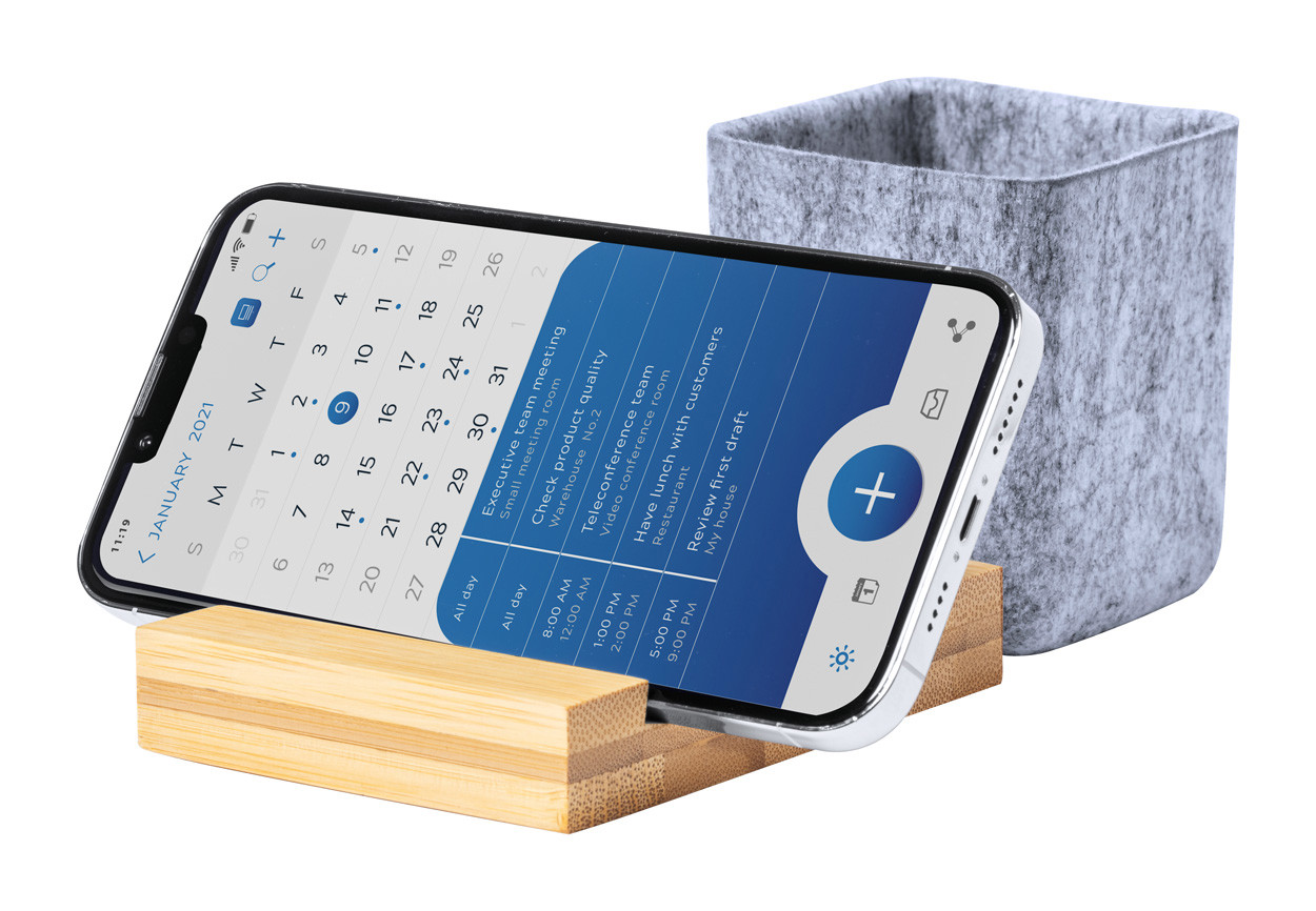 Bamboo desk organizer with mobile phone holder and RPET felt pen holder.