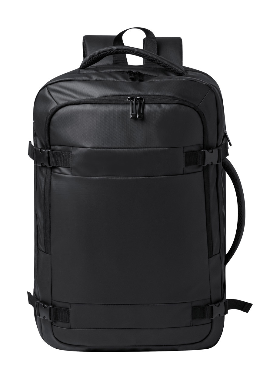 Dual function backpack and document bag in PU leather with zipped compartments, padded laptop (17") and mesh compartment, trolley strap, padded back and shoulder straps.