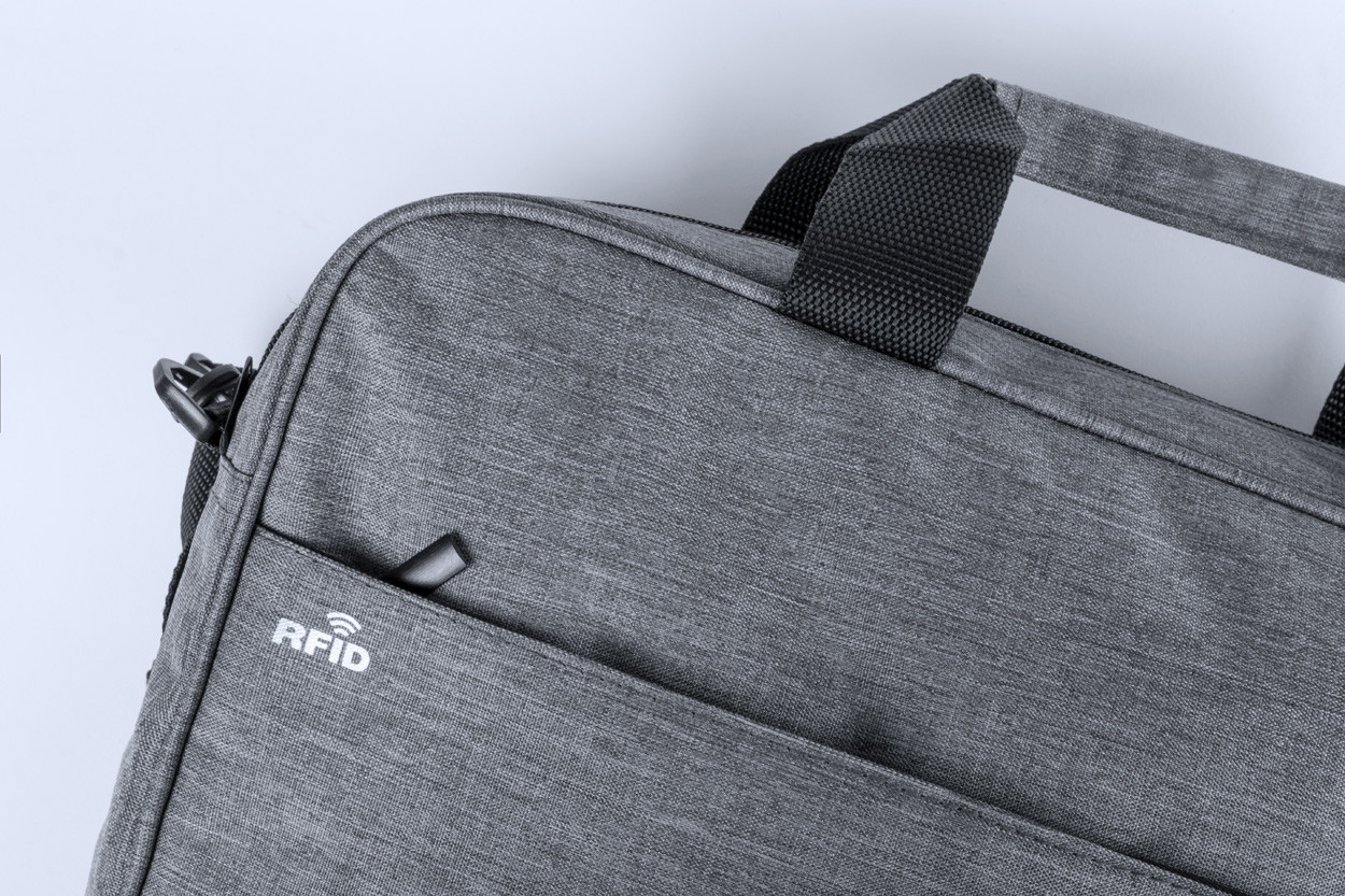 RFID protected document bag with padded laptop and tablet compartment (15" & 10"), padded back and shoulder strap. With built-in USB connection for power banks. 300D polyester.