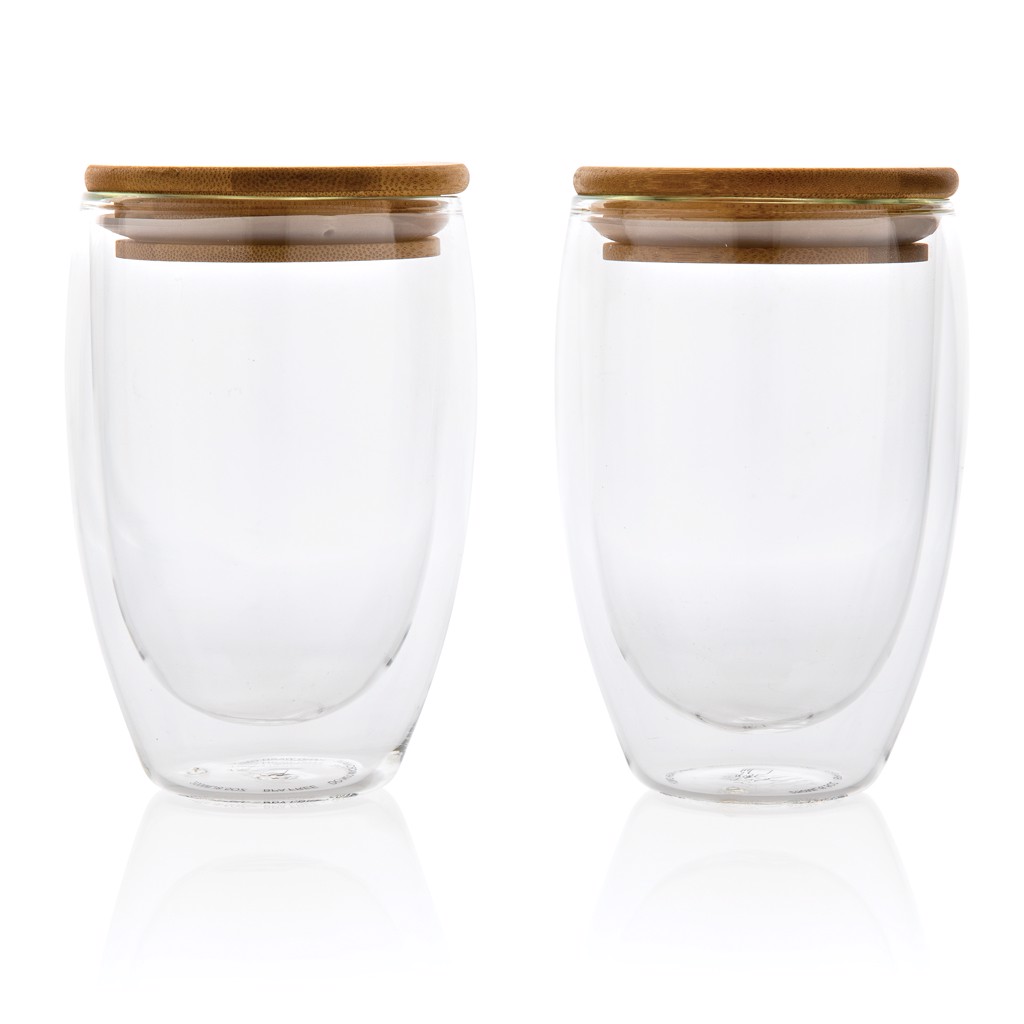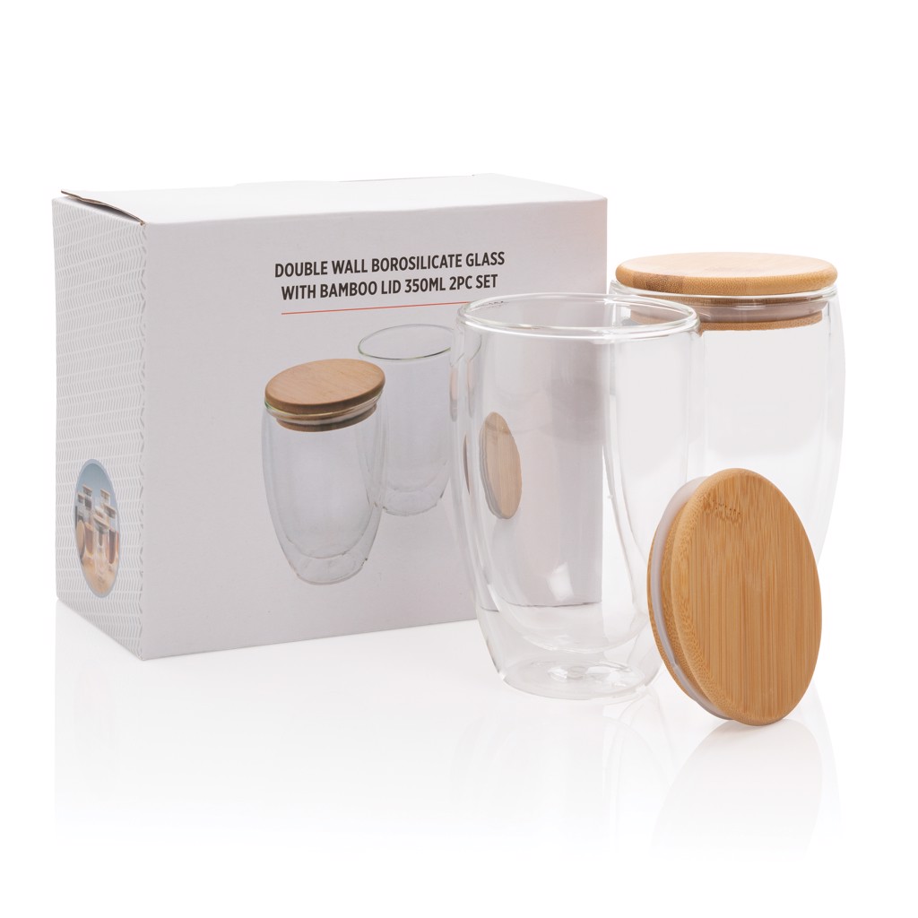 This double wall borosilicate glass set has a sleek 2 layer design which showcases all your favourite drinks! No matter what you serve, cappuccino, tea or latte, it will be nice and hot while your hand stays cool. Incudes a bamboo lid. It is recommended to handwash the glass and bamboo lid. In a full colour gift box. Capacity per glass 350ml. BPA free.