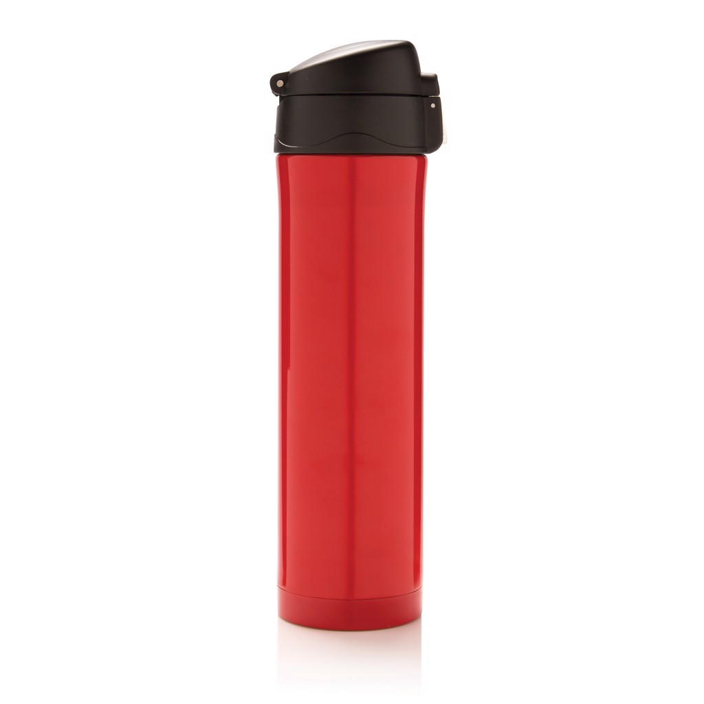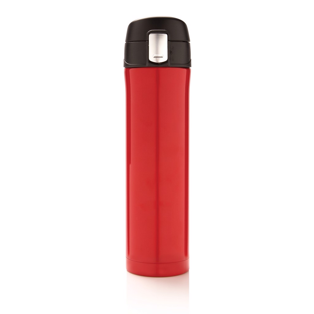 Double wall stainless steel vacuum flask that keeps your drink warm for up to 5 hours or cool up to 15 hours. The lid is lockable and therefore avoids any risk of leaking or spilling. The lid is easy to keep clean for optimal hygiene and can even be washed in the dishwasher. The unique design of the flask allows you to drink conveniently and safely with one hand directly from the flask. The size of the flask is suitable to place in any car drink holder. Capacity: 450 ml.