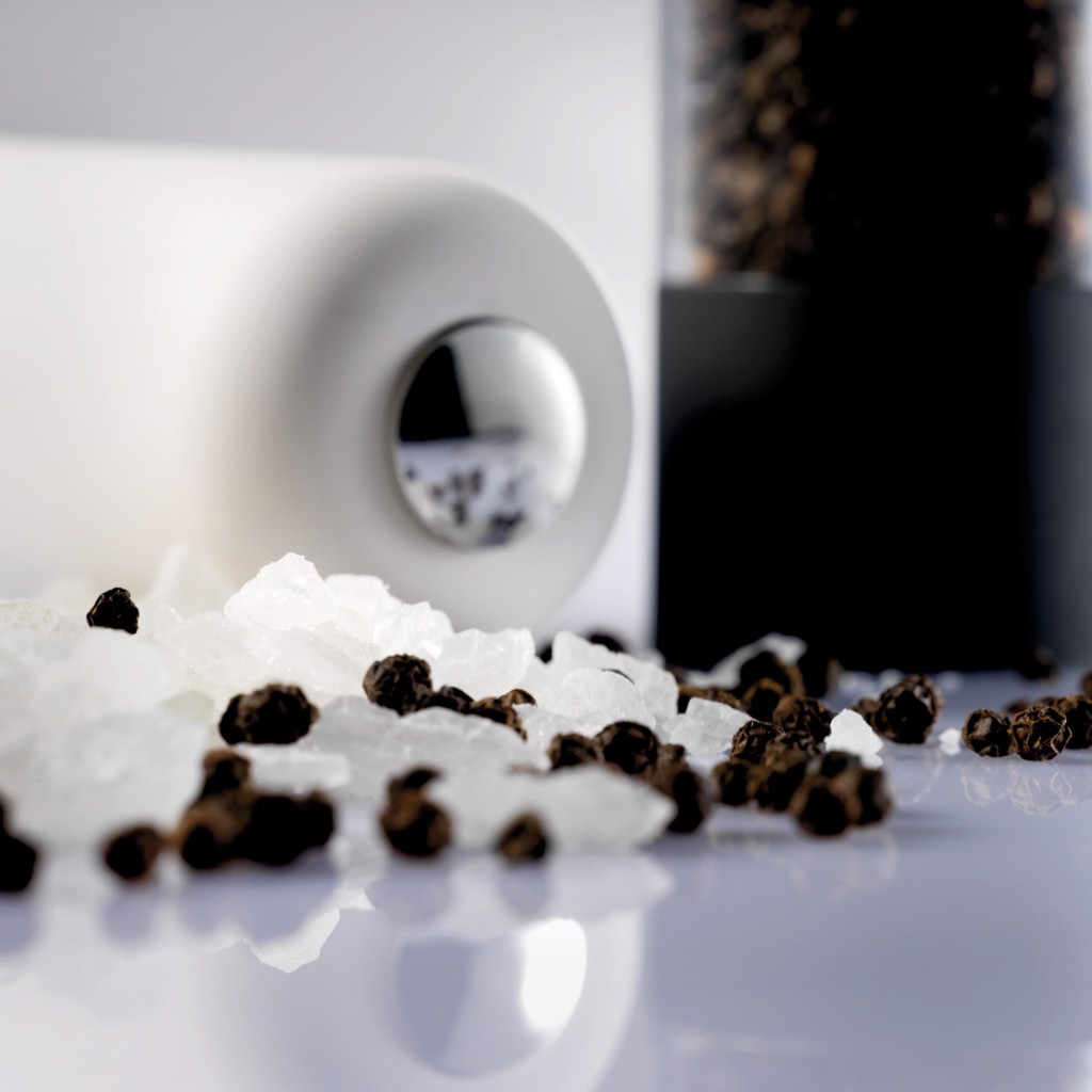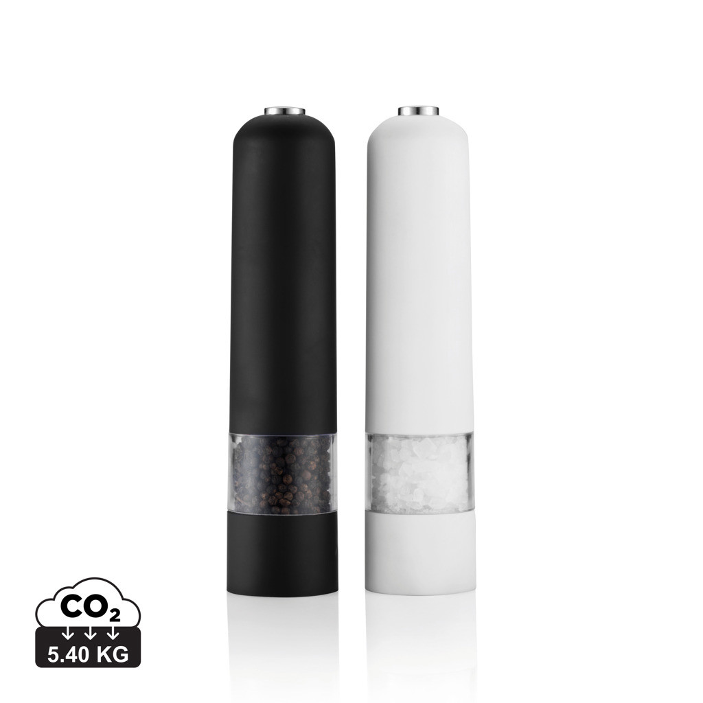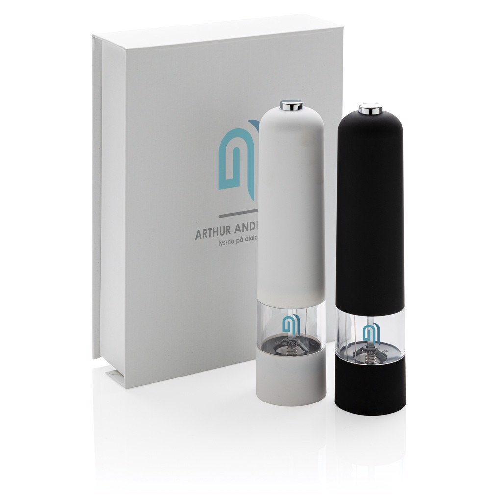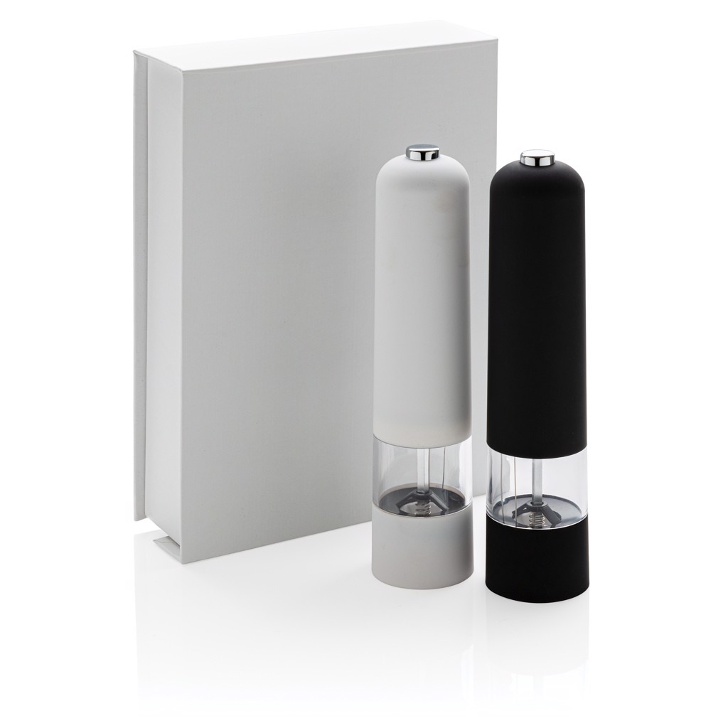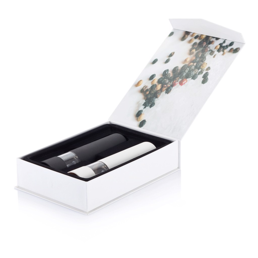 ABS with rubber spray finish, adjustable ceramic mill, with light function. Packed in magnetic gift box.