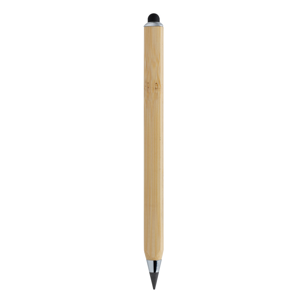Modern infinity pen made with FSC® 100% certified bamboo. Triangle shaped body, one side with CM indication and one side with Inches. Traditional wooden pencils write only up to around 200 metre but this Tree free infinity pencil, has a writing length of up to around 20000 metres using a graphite tip to produce a graphite line. Not only does it write like a pencil, but the markings can be erased. It works by leaving a graphite line on paper just like a regular traditional wooden pencil but it wears down so slowly, that it should outlast up to 100 traditional wooden pencils! With touch tip to operate mobile device. Packed in FSC® mix packaging.