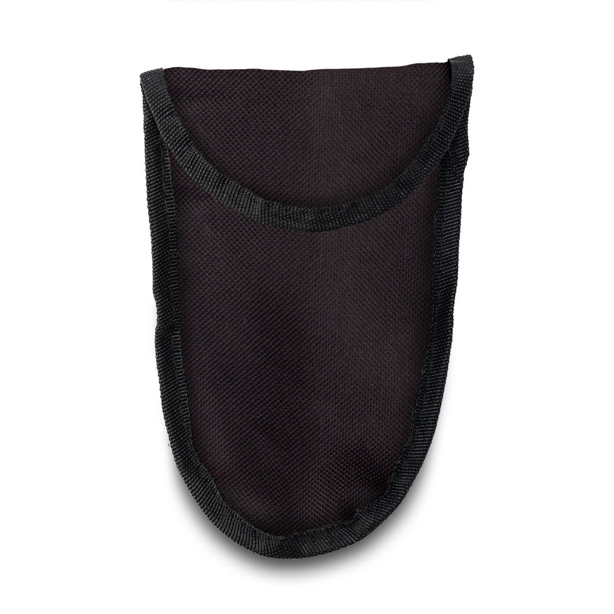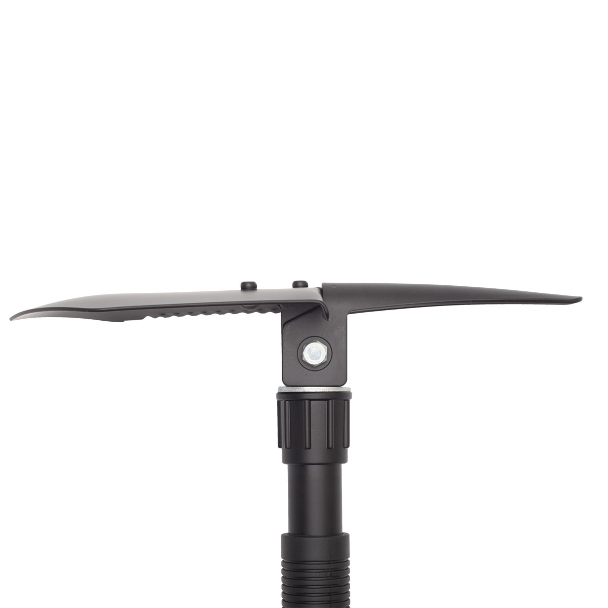 Folding shovel that can also serve as a pick or saw. Comes in polyester case with velcro fastener.