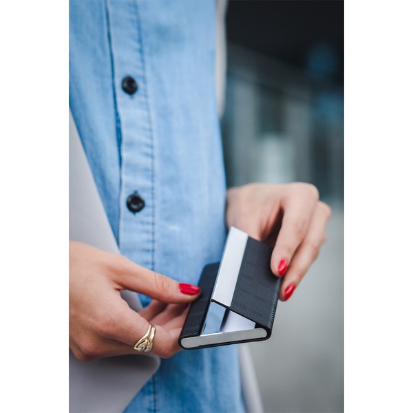 Metal & PU gift set containing a business card holer for 15 cards, keyring and ballpen with blue refill. Packed in a gift box.