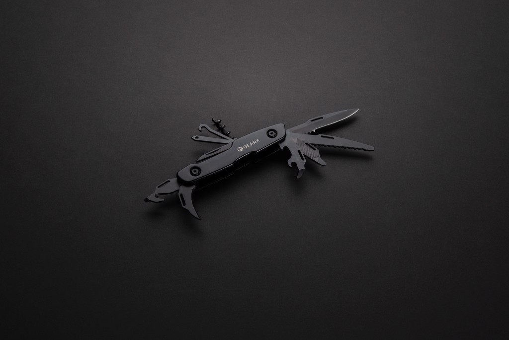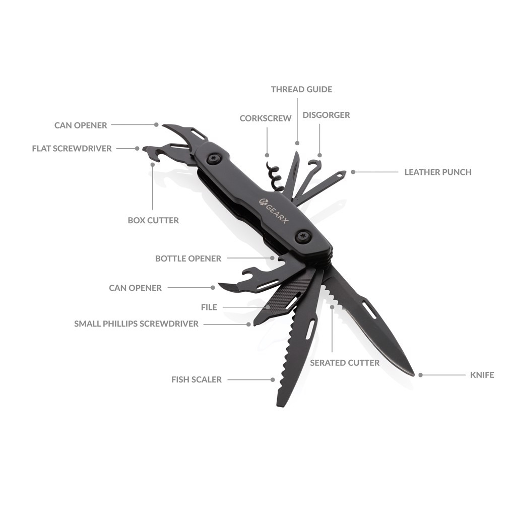 Straight clear lines combined with great functionality. This multifunctional tool combines it all, in one pocket sized essential. The luxury aluminum body is matched with premium grade 420 stainless steel tools all presented in black. The 13 functions include: Knife, saw, slotted screwdriver, can opener, file, small Philips screwdriver, Philips screwdriver, corkscrew, thread guide, leather punch, box cutter, bottle opener and small blade. This multifunctional knife is ready for use when you need it. Packed in luxury gift box.
