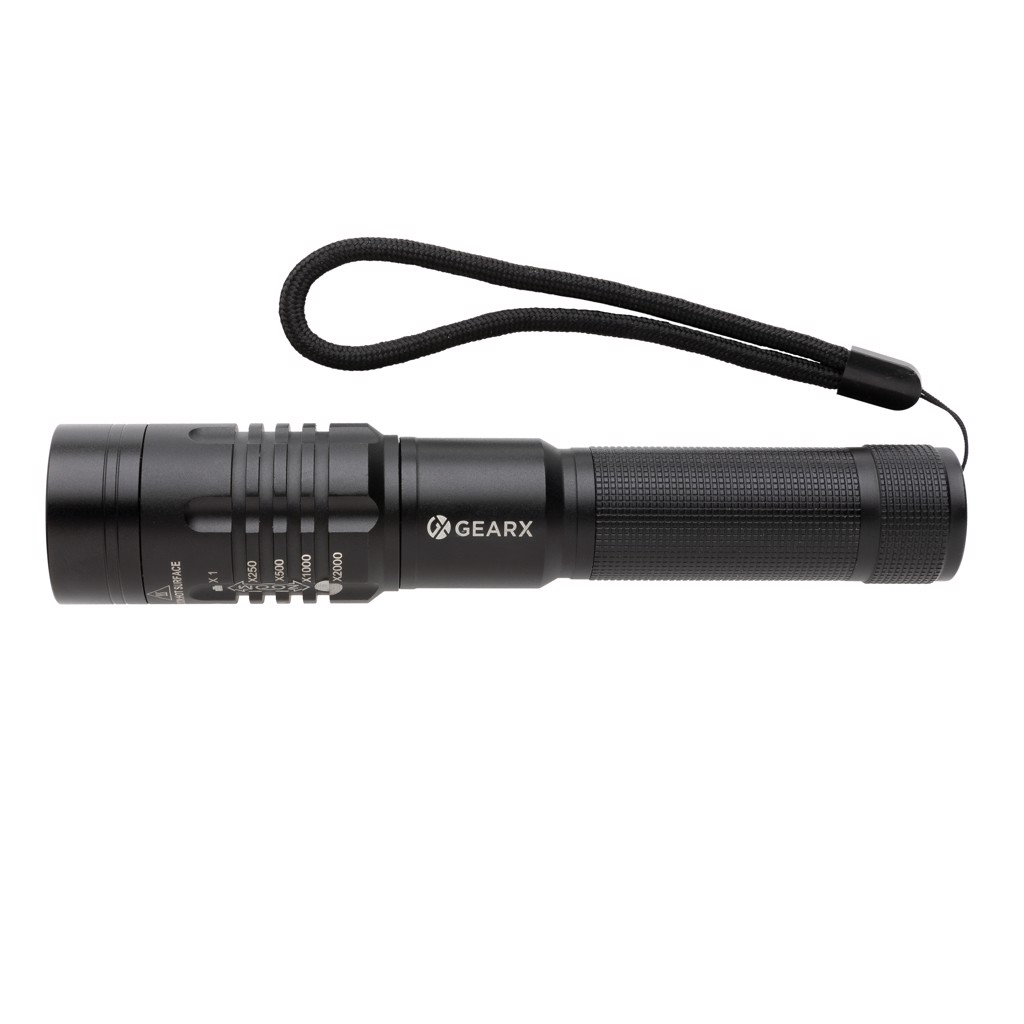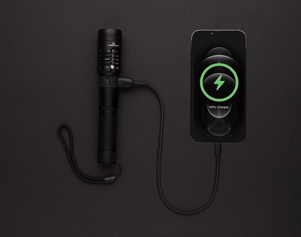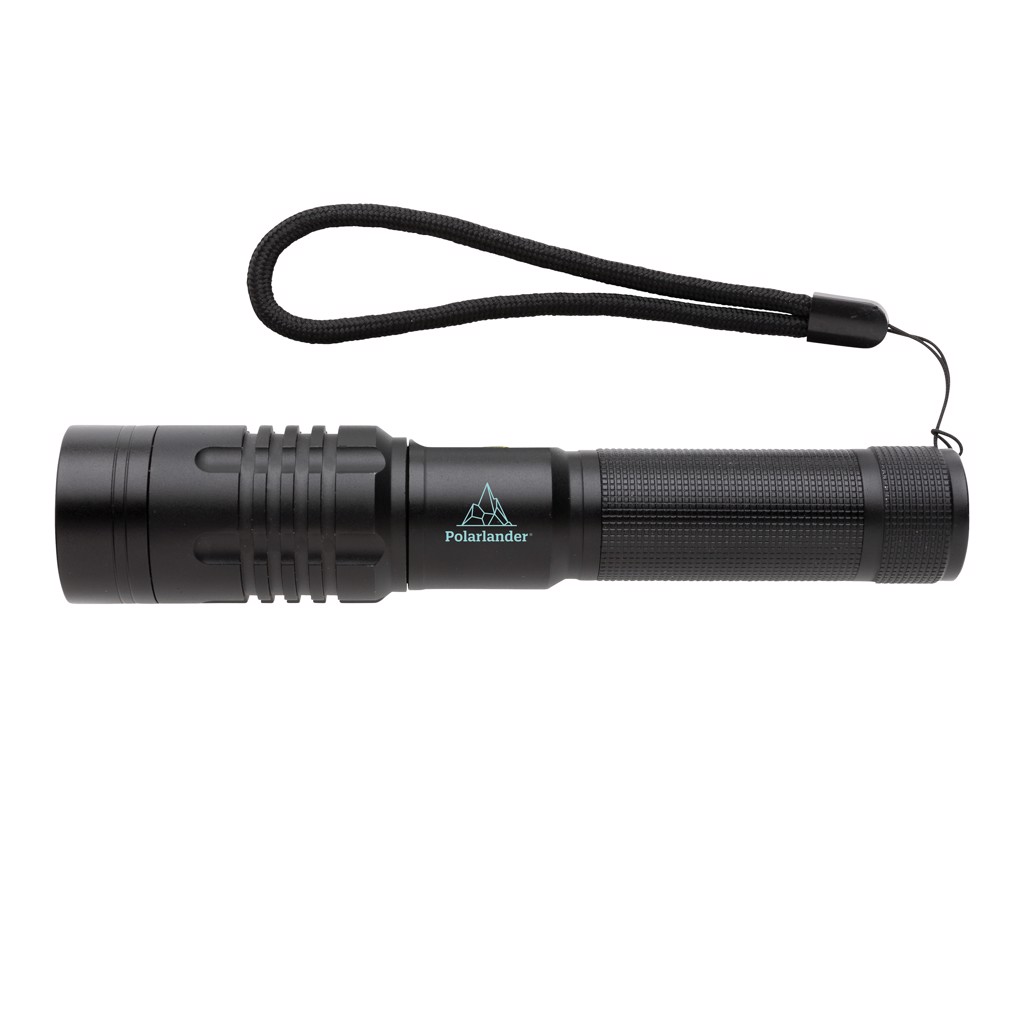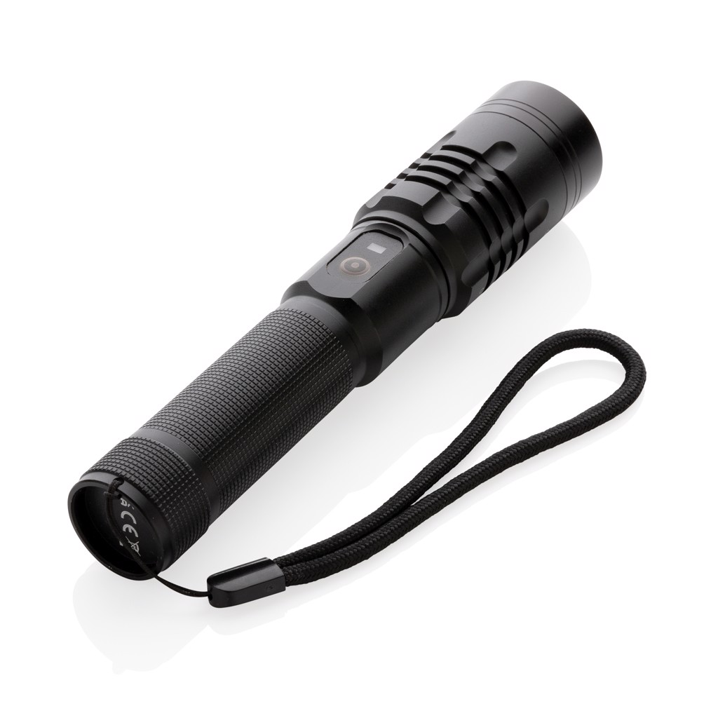 Functionality, performance and design all come together in this re-chargeable torch. The high quality aluminum alloy body fits perfectly in your hand. The premium focus light allows you to extend the light up to 2000 times. Because of its IP4 rating, it is weather proof so can easily be taken outside. The powerful bulb creates up to 1000 lumen and a beam that reaches up to 500 metres. The torch uses a re-chargable battery so no need to replace the batteries. Simply re-charge via your USB socket. The high quality bulb comes with 5 modes including SOS function. The 2000 mah battery allows a usage up to 4 hours on a single charge.