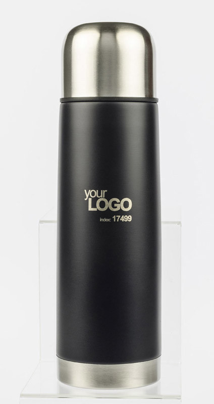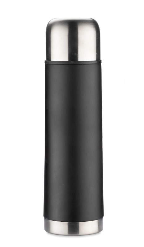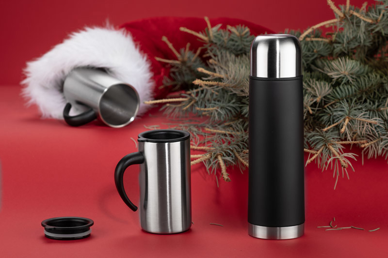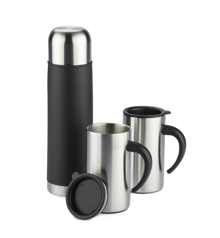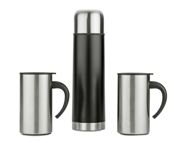 500ml stainless steel vacuum flask and 2 mugs (with 260ml capacity each). The set is packed into a black cardboard box.