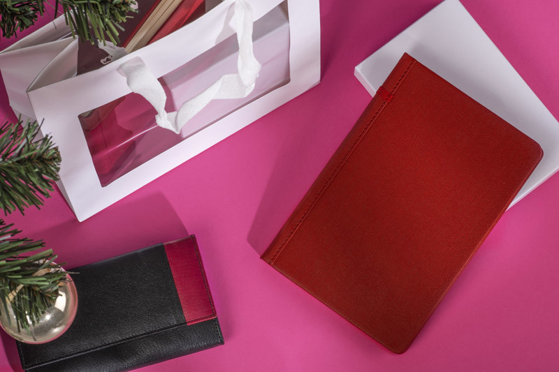 HER gift set is an ideal proposition for ladies. It is aesthetically pleasing and tasteful. The set includes a wallet, a notebook and a gift bag. The wallet is made of natural leather in black with a red insert, which makes the wallet look very interesting and unusual. It has an external zippered pocket. Inside there are 5 credit card tabs, 5 document compartments and a zippered pocket. The notebook is made of leather-like material (PU). It has a hard binding finished with a pleasant to the touch texture. The whole set can be packed in the included gift bag. It will beautifully expose the gift wrapped in it. The bag is made of paper.