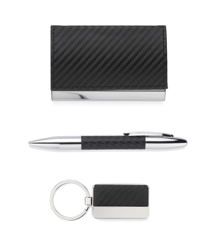 Elegant gift set which includes business card holder, key chain and a ball pen. All packed in a black box. Logo can be engraved on the keychain or business card holder.