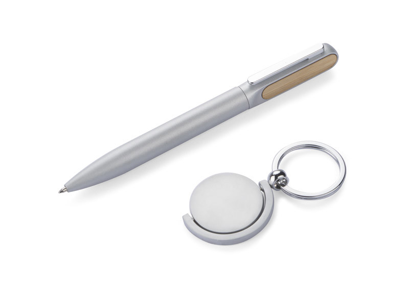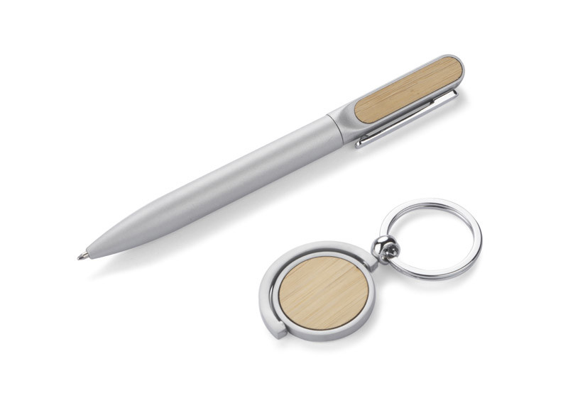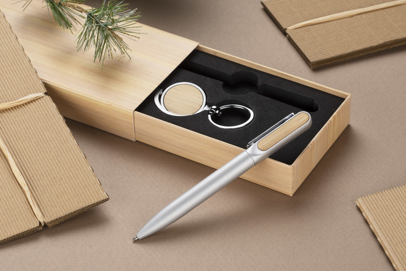The elegant SELO gift set consists of a pen and a key ring. Both pritems have bamboo elements, which gives them an interesting look. The SELO set is the perfect gift idea. Packed in a box made of material imitating bamboo. Product dimensions: 140 x ⌀ 12 mm (pen); 35 x 40 x 4 mm (keychain); 170 x 92 x 26 mm (box).