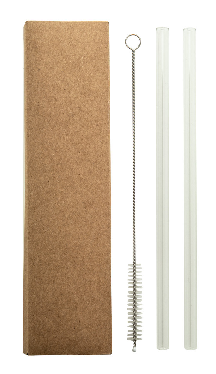 Set of 2 reusable borosilicate glass drinking straws and cleaning brush. In kraft paper box.