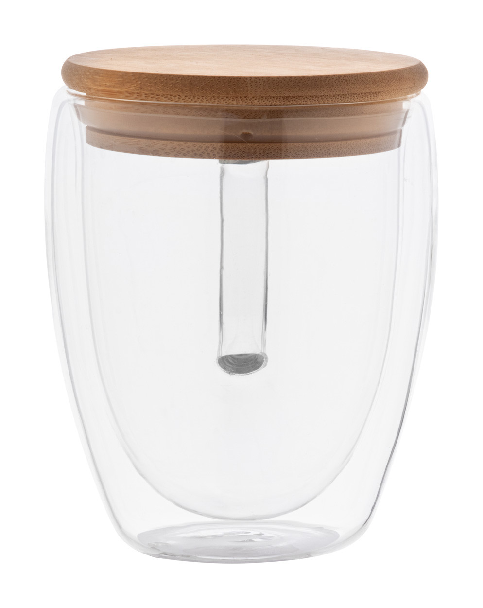 Double-wall borosilicate glass thermo mug with handle and bamboo lid, 350 ml. In kraft paper box.