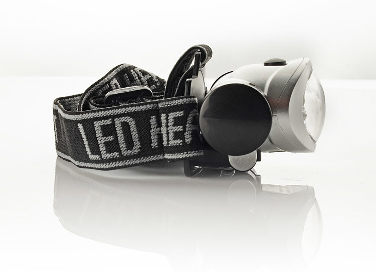 Very practical head light with 8 leds. It has strong and durable elastic strap with adjustible length. It also has adjustible lighting angle and 3 possible lighting options: 2, 4, 8 leds. This flashlight is powered with 3 AAA bateries. This gadget may be very useful during your travels or domestic chores.
