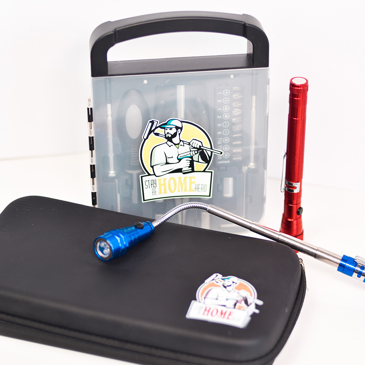 Multi-piece tool set in a box with a handle. Includes: PH precision screwdriver, slotted precision screwdriver, adapter (1/4"), Torx wrench - 3 sizes, slotted screwdriver - 2 sizes, PZ screwdriver - 2 sizes, PH (phillips) screwdriver - 2 sizes sizes, Allen key - 2 sizes, Socket/ring spanner - 5 sizes (6-10), Combination pliers, Universal magnetic screwdriver holder (1/4"), 35 mm (1/4") extension.