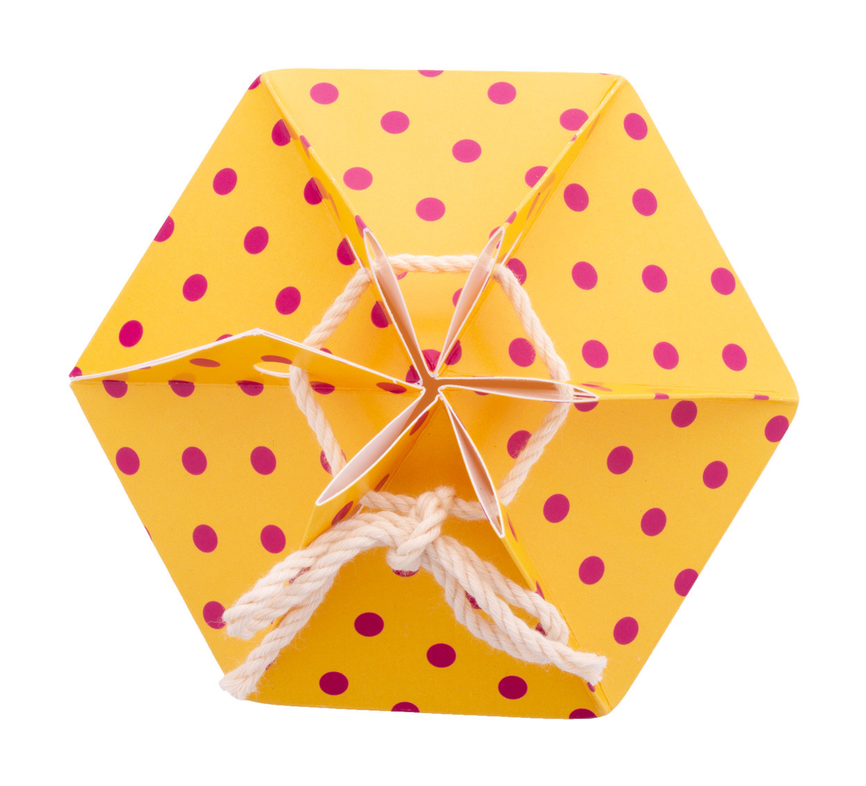 Custom made, full colour printed paperboard hexagonal gift box with string closure. Delivered flat-packed. MOQ: 50 pcs.