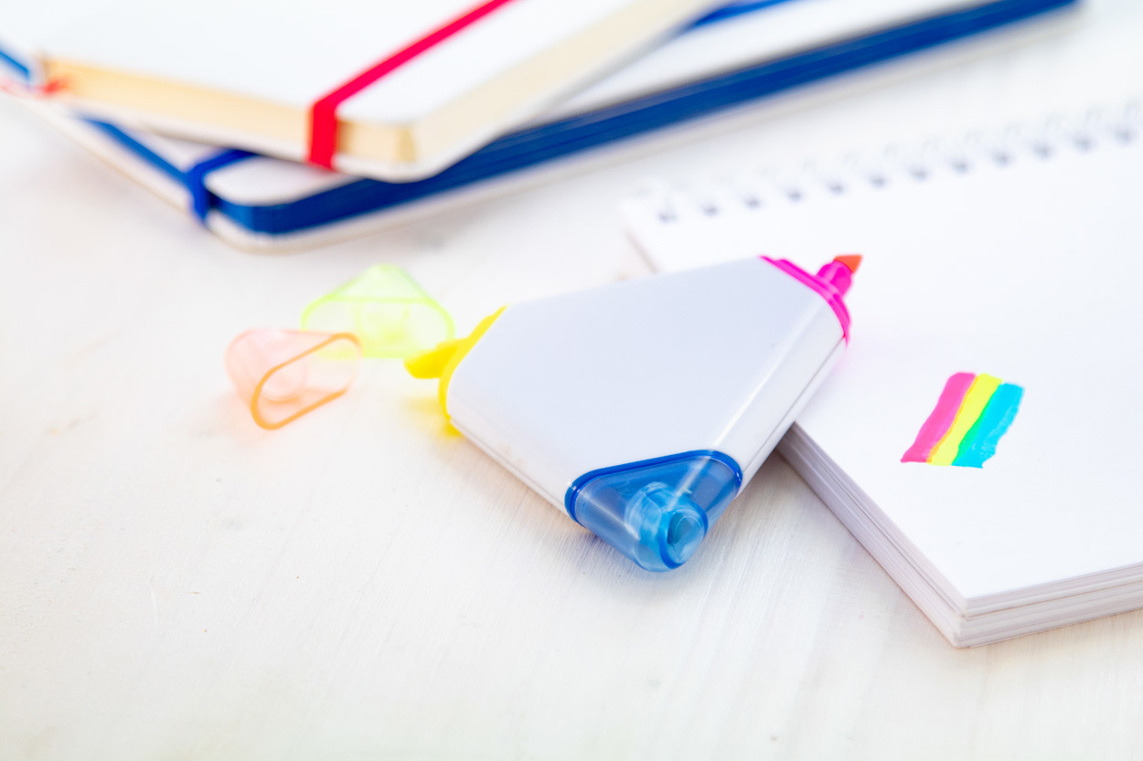 Triangle shaped highlighter with 3 different coloured markers with transparent caps.