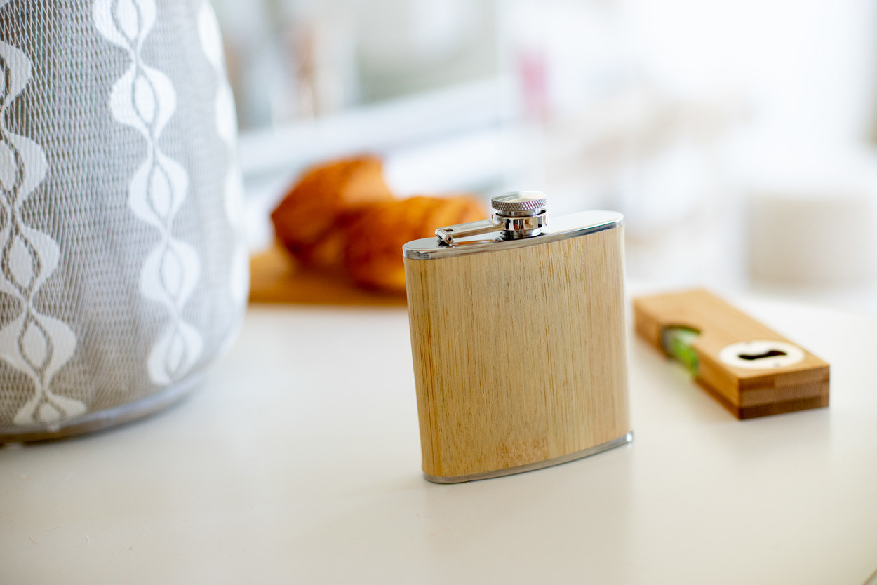 Stainless steel hip flask with bamboo overlay, 175 ml.