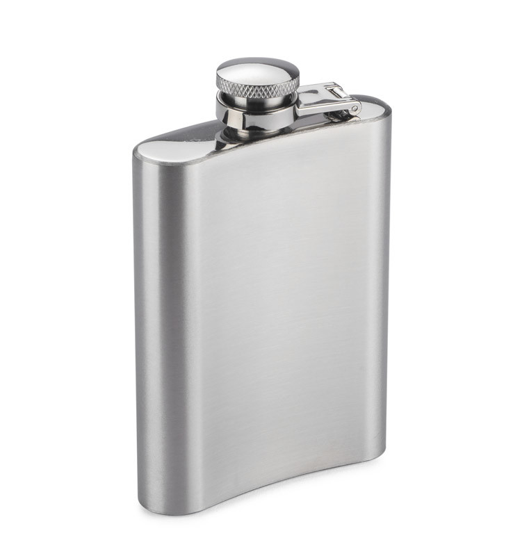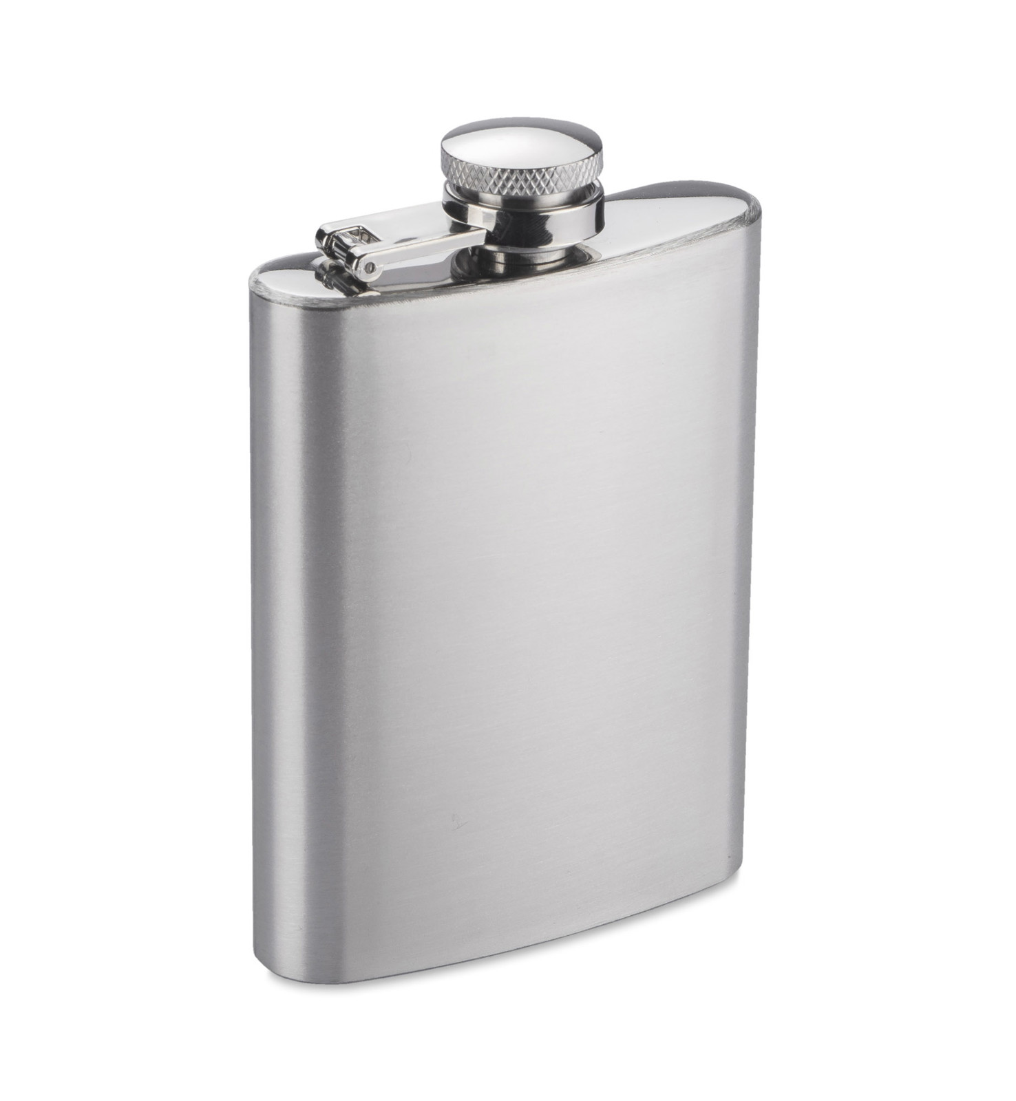 Stainless steel 110ml hip flask with a safe closure. Logo might be engraved on the article's surface.