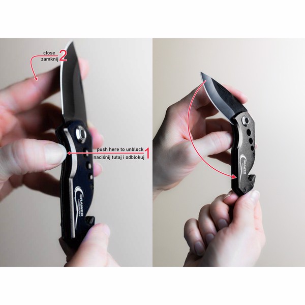 2CR13 metal 58 mm blade foldable knife coming with a car glass hammer, safety belt cutter and belt clip. It comes with safety lock. Packed in black polyester case.