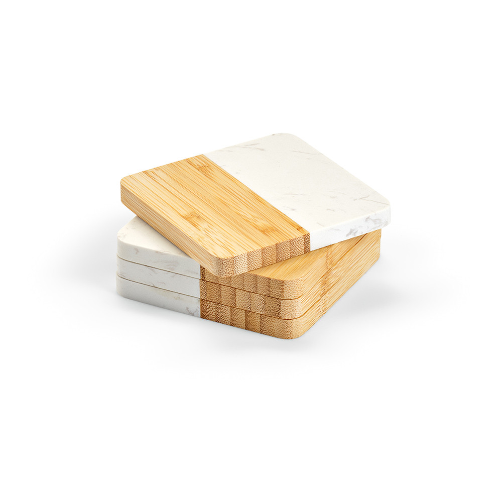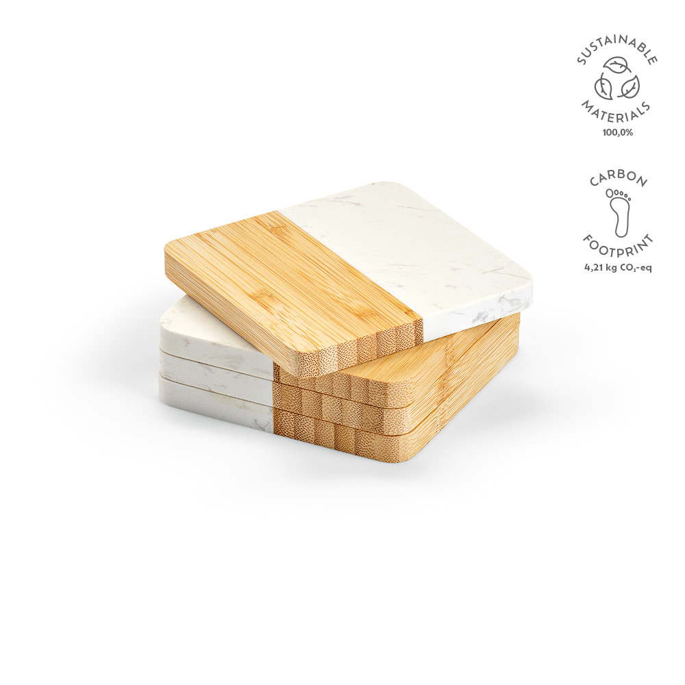 Kahlo is a set of 4 coasters made from bamboo and marble. Dimensions of 10x10x2.8cm ensure a perfect fit for your glasses. Delivered in a kraft box, it's a stylish and eco-friendly choice for your home.