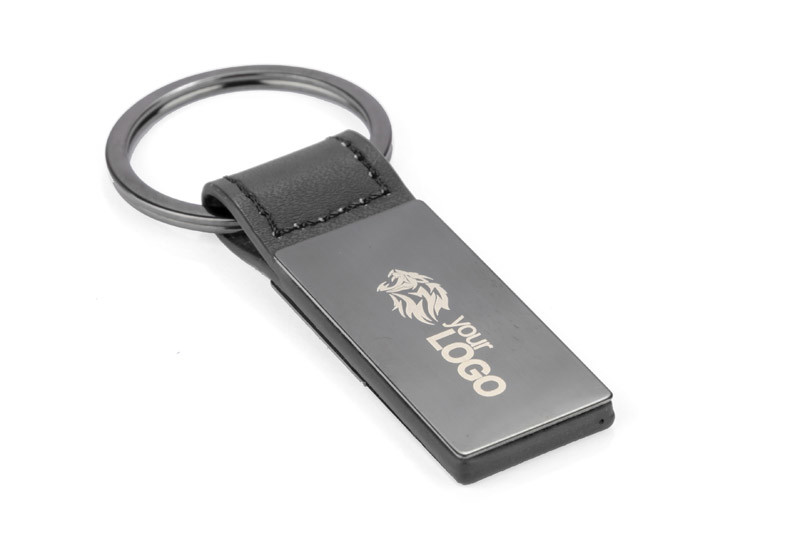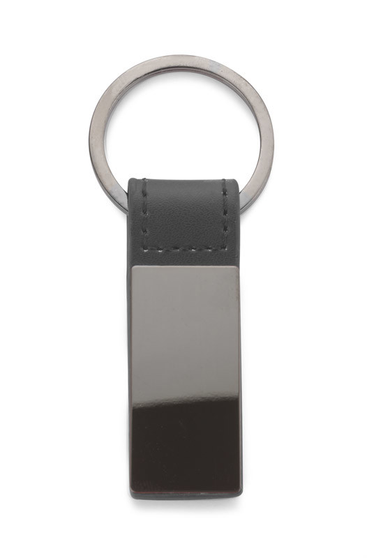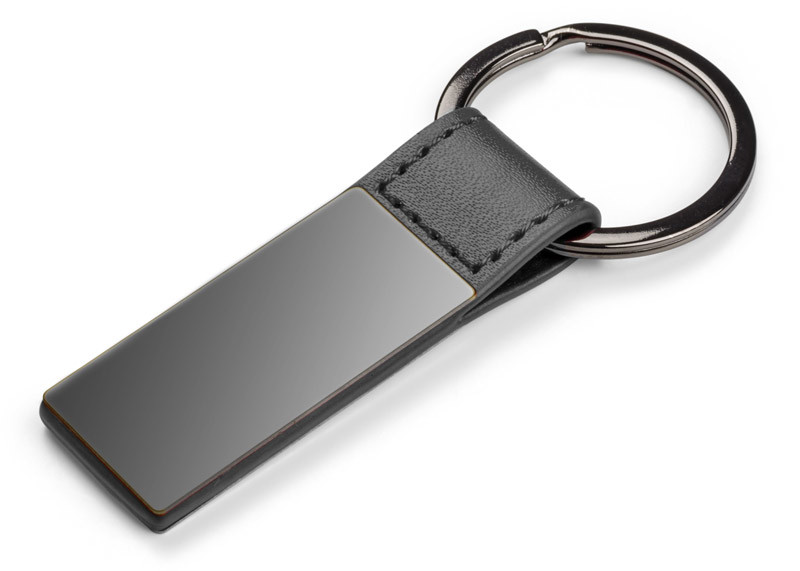 Elegant double-sided key ring made of PU leather-like material and metal in graphite color. We will engrave your logo on the metal plate.