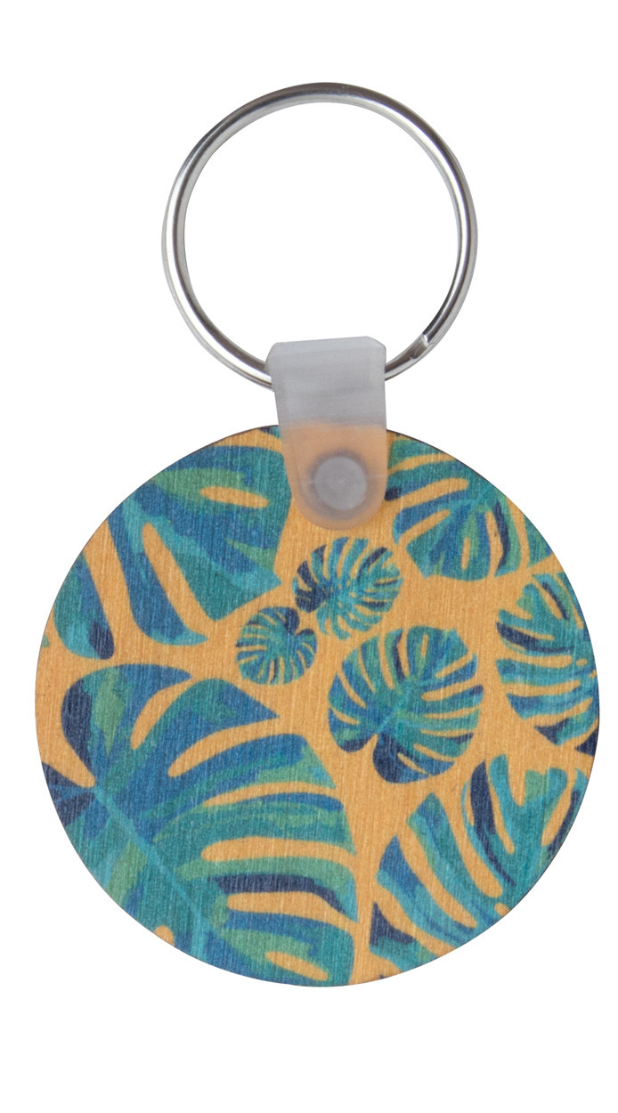Round shaped, laminated birch wood keyring with full colour printing. Price includes UV LED printing on one side. MOQ: 200 pcs.