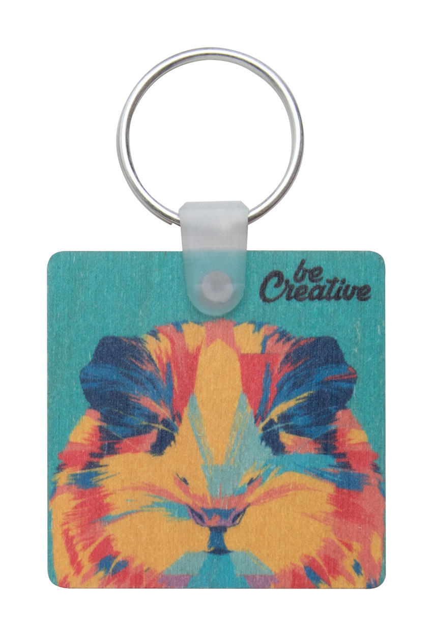 Square shaped, laminated birch wood keyring with full colour printing. Price includes UV LED printing on one side. MOQ: 200 pcs.