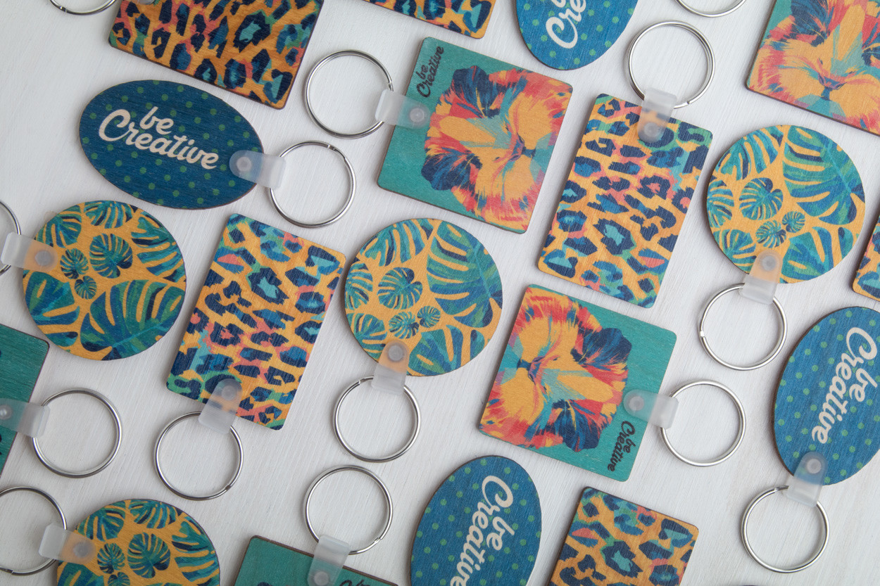 Rectangular shaped, laminated birch wood keyring with full colour printing. Price includes UV LED printing on one side. MOQ: 200 pcs.