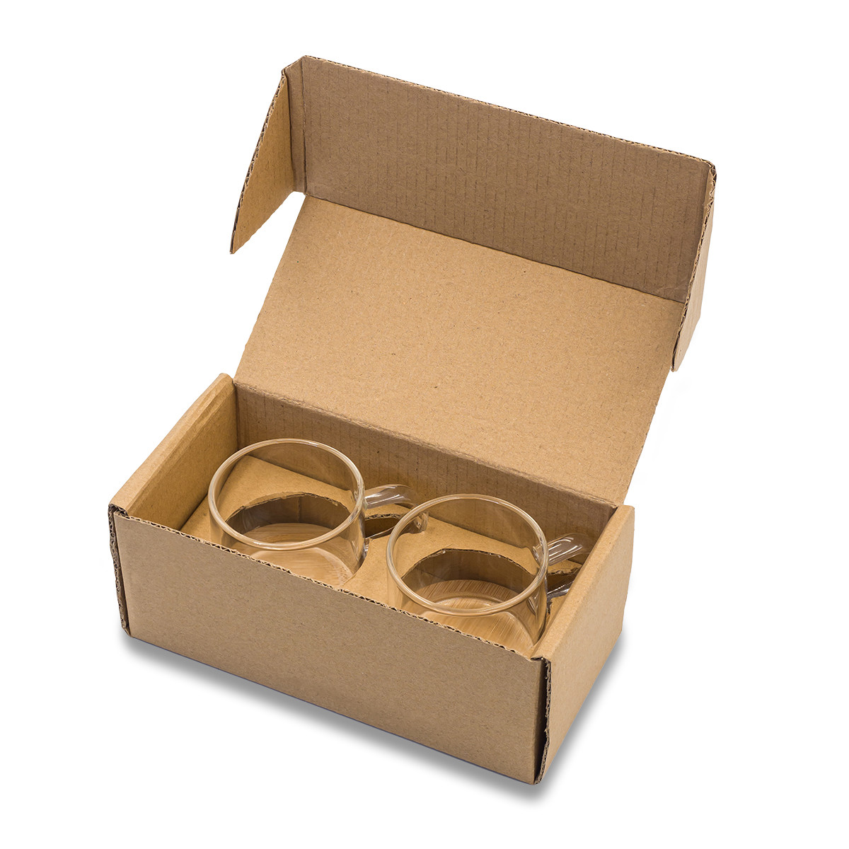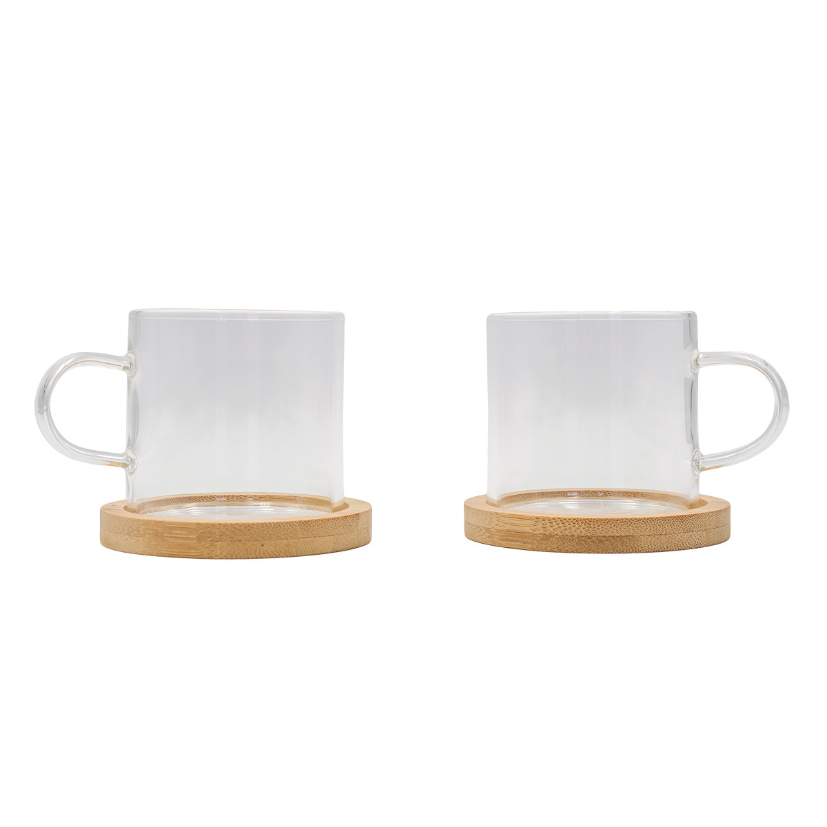 Set of 2 borosilicate glass cups with bamboo coasters. Capacity of cup 125 ml.