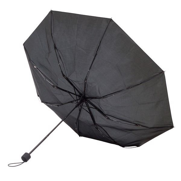 Manually opened & closed 190 T polyester folded, windproof umbrella. Frame and ribs are made from fiberglass and aluminium. Metal shaft. Soft touch plastic rubberized handle comes with an elastic tape hand loop. Packed in waterproof pongee case. 970 mm in diameter.