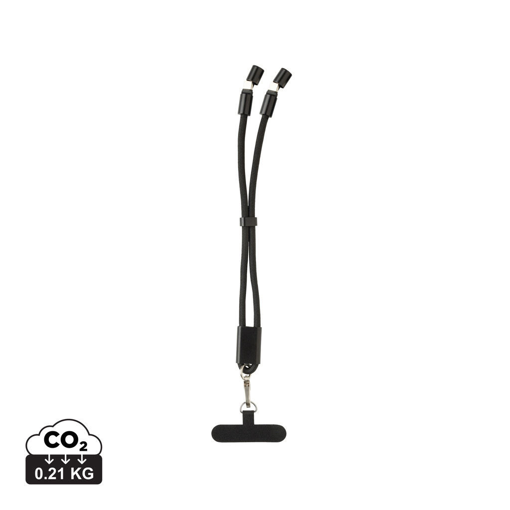 Introducing LoopAmp, a phone cord made out of RCS certified RPET. RCS (Recycled Claim Standard) is a standard to verify the recycled content of a product throughout the whole supply chain. Total recycled content: 78% based on total item weight. Crafted as a premium-quality wrist strap, its high-strength lanyard wraps comfortably around your wrist, and the precision-crafted connecting ring and hook guard against accidental drops—ideal for hands-free convenience during your daily commute, workouts, or quick errands. LoopAmp also doubles as a USB-C charging cable with up to 60 W of fast-charge power. Effortlessly top up your smartphone, tablet, or even a laptop with industry-leading efficiency, thanks to reinforced connectors and ultra-durable materials designed for reliable daily performance. Enjoy the perfect blend of safety, freedom, and high-performance charging with LoopAmp. Support Data transfer. PVC-free and packaged in FSC packaging.