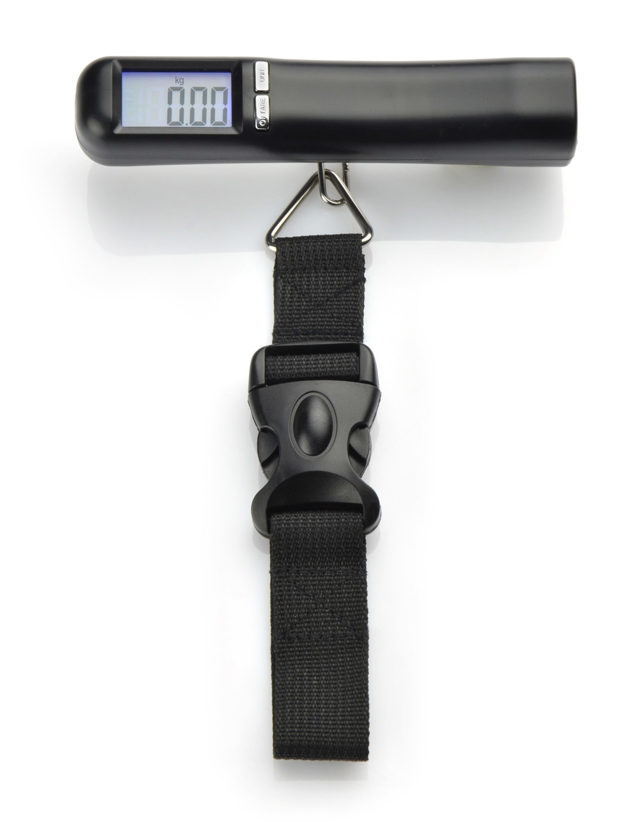 The VALISA electronic luggage scale displays weight in four units: grams, kilograms, ounces, and pounds, with a maximum capacity of 50 kg. Easy to use – simply turn it on, attach your bag to the strap, lift it up, and read the weight on the display.