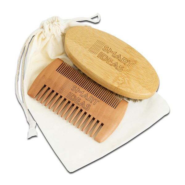 3-piece grooming kit: beard brush, comb and drawstring cotton bag all packed into kraft box.