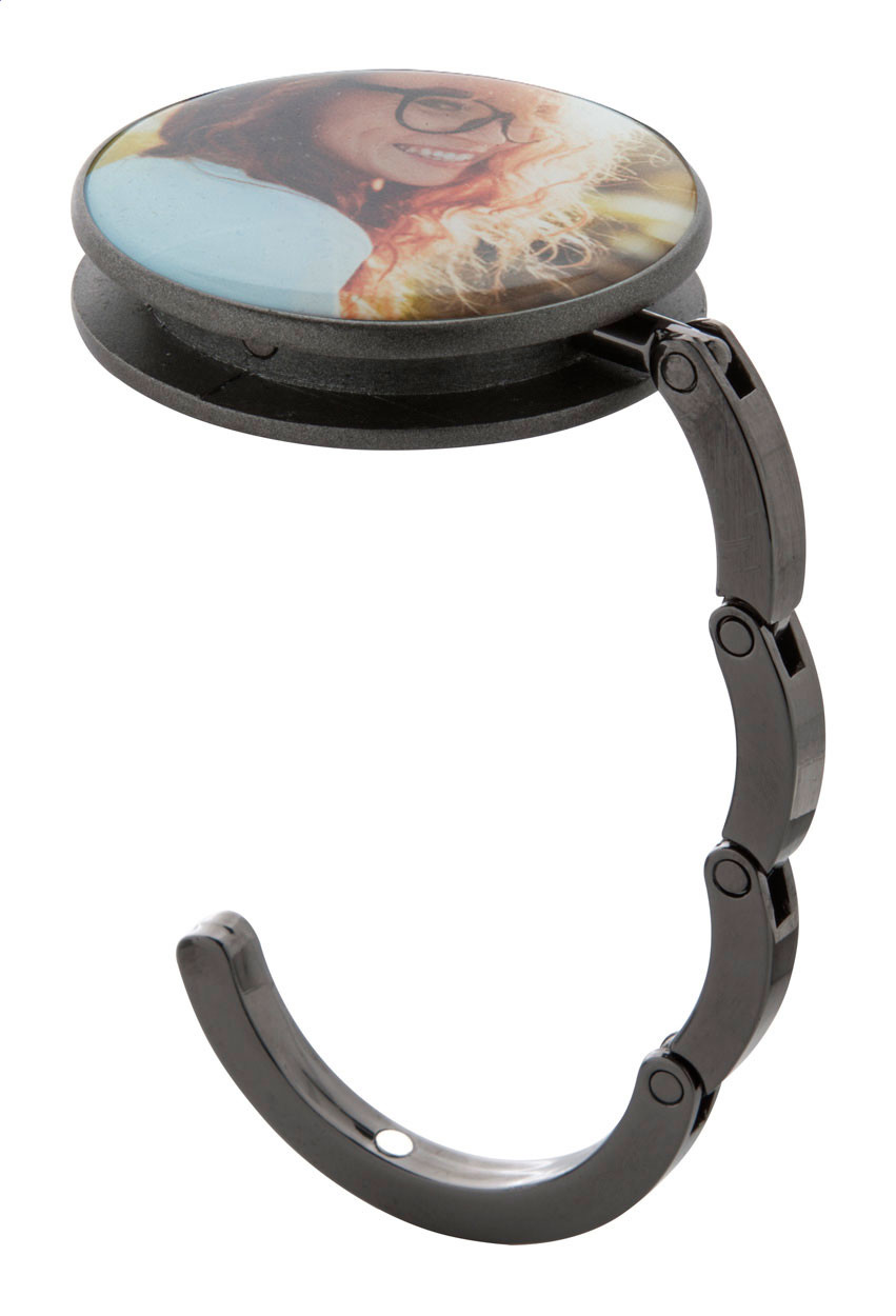 Metal bag hanger with gunmetal finish and shiny plate. With magnetic closure. Delivered in black paper box.