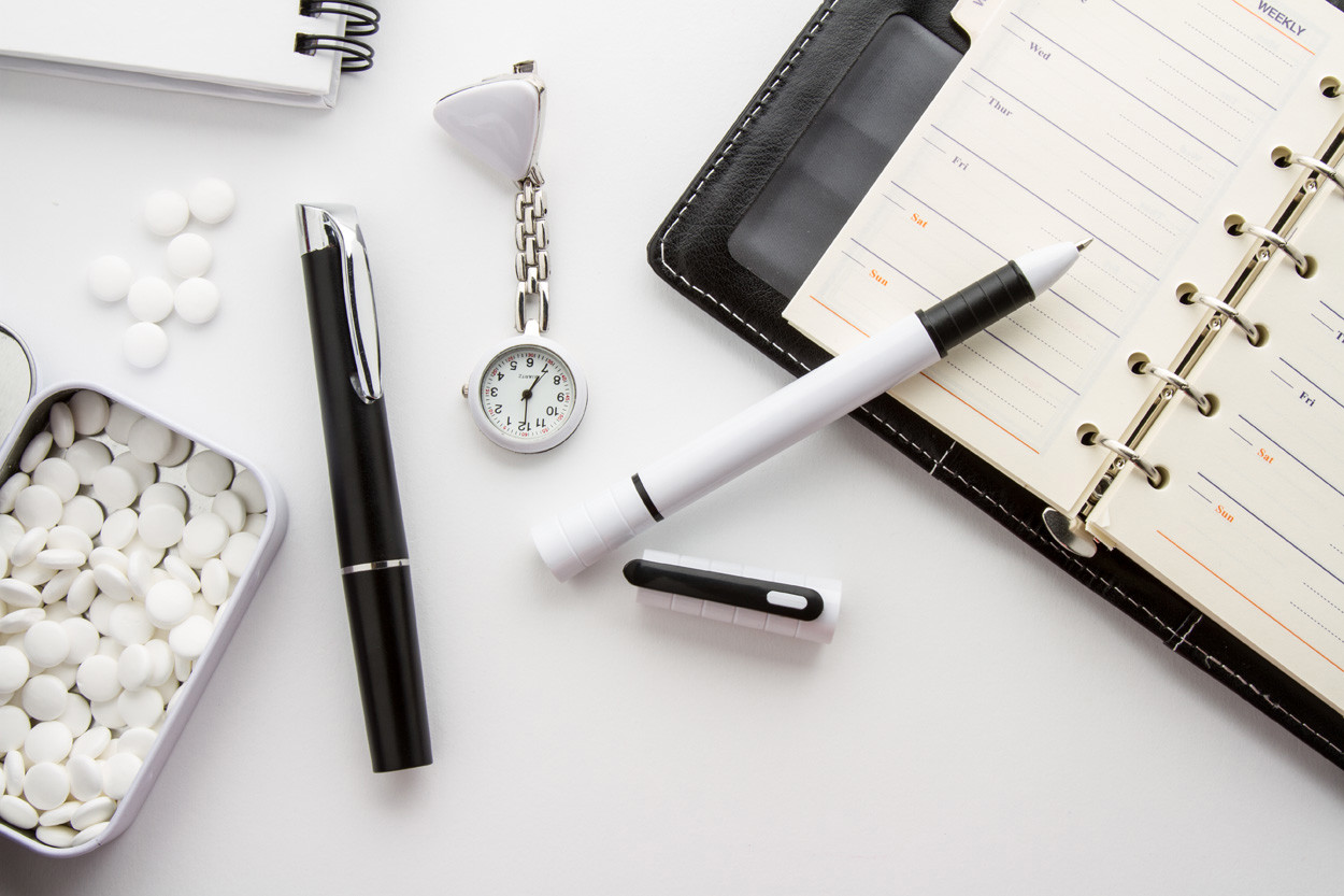 Plastic ballpoint pen with LED flashlight. Delivered with blue refill and button cell batteries.