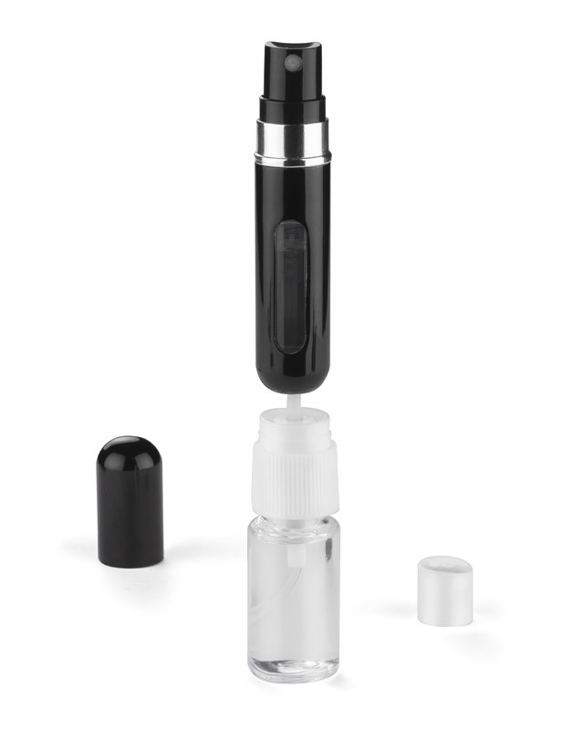 A mini perfume bottle is a gadget that will be perfect for travel and everyday use. We can easily and quickly fill the bottle with your favorite perfume (or disinfectant). Just put the bottom of the bottle on the atomizer of the selected liquid and fill the perfume with a gentle movement by pressing. 5ml bottle capacity.