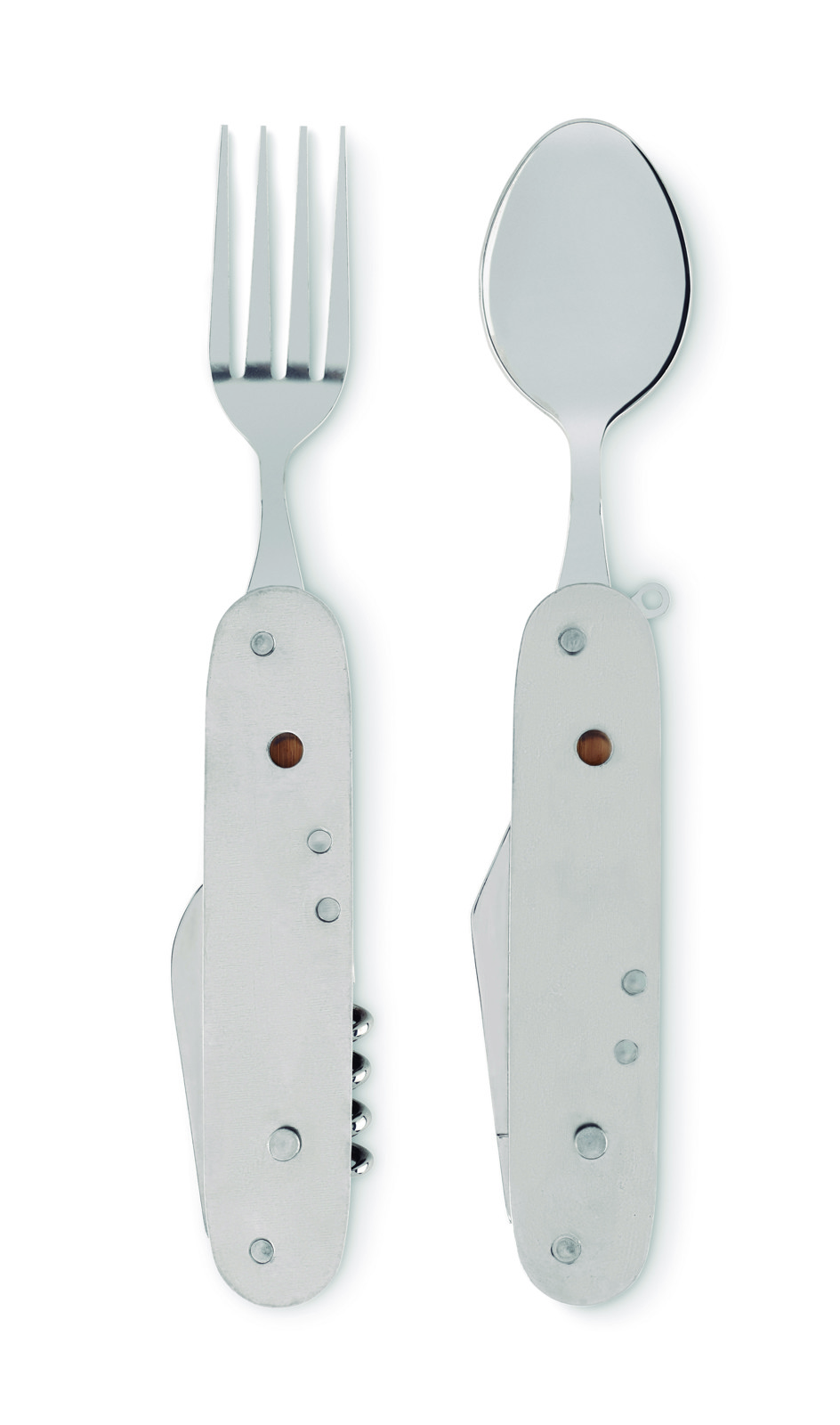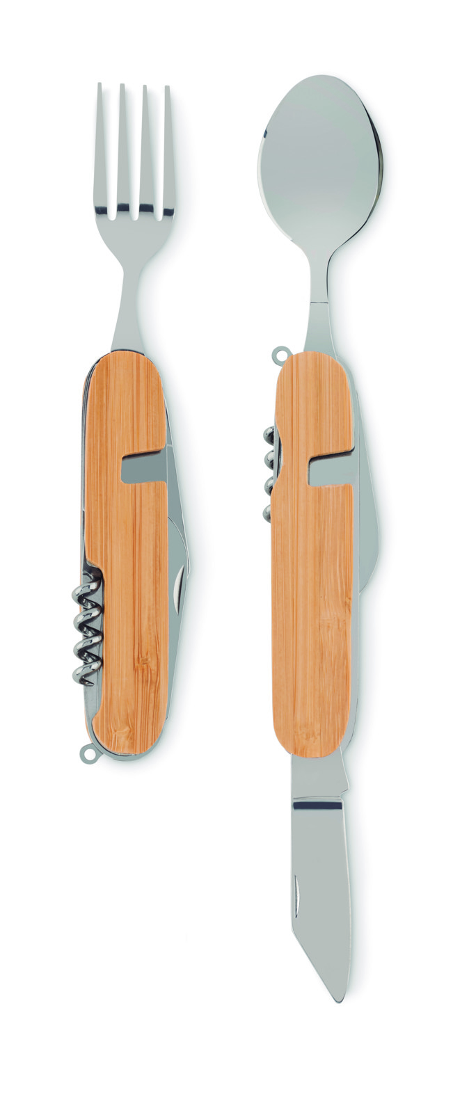 Metal multi-function folding camping cutlery set in wooden casing. 5 functions. Includes fork, spoon, can opener, wine opener and knife. You can separate the pieces in 2.
