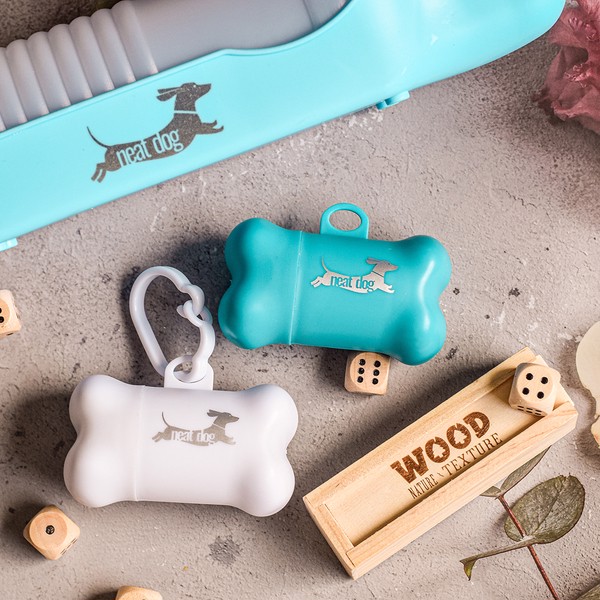 Handy dog waste bag dispenser with a plastic hook. It holds a roll of 20 bags.