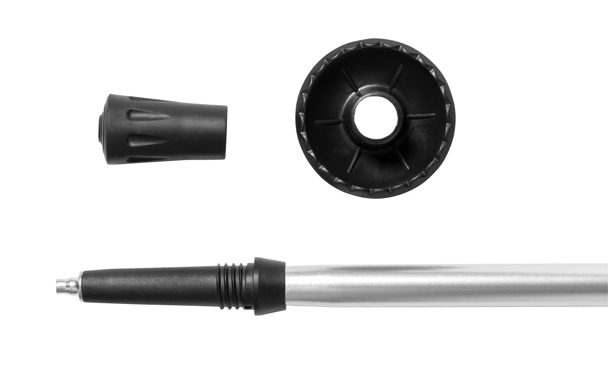 Telescopic nordic walking stick with aluminium body, ergonomic natural cork grip, wrist strap and anti-shock system. With snow basket in non-woven carry bag.