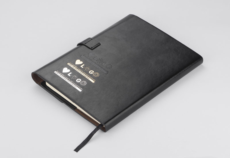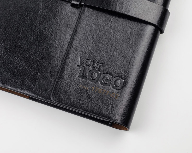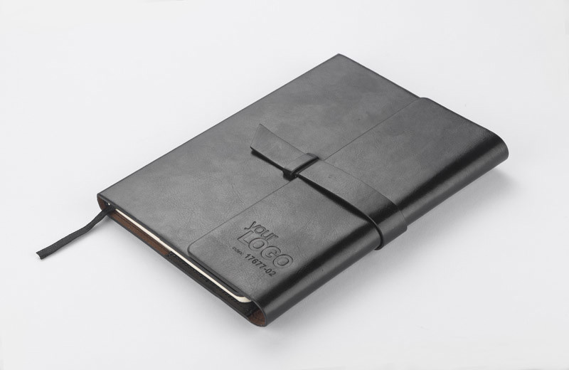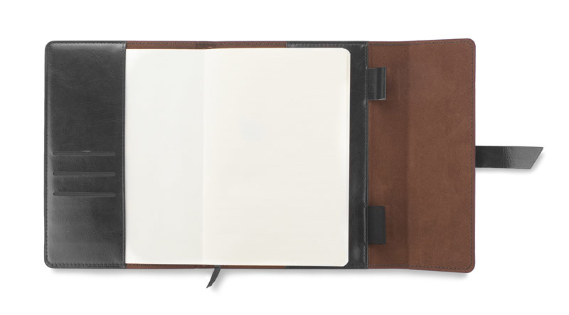 VASCO is an elegant A5 format notebook with a classic cover made of leather-like material (PU). The notebook contains 80 lined pages and a practical ribbon - bookmark. Inside the cover there is space for 3 business cards, a pen and a USB flash drive. The cover is not permanently fixed to the notebook block, but slid over the first pages, which gives the possibility to replace the notebook. The notebook closes with a strip made of leather-like material (PU).