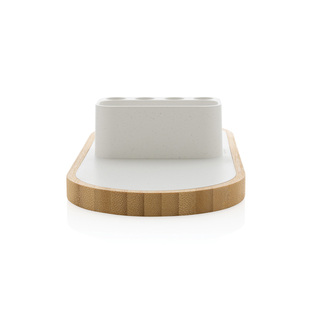 Dual 10W fast wireless charger with pen holder made with RCS (Recycled Claim Standard) certified recycled ABS. Total recycled content: 31% based on total item weight. RCS certification ensures a completely certified supply chain of the recycled materials. The base is made from FSC®100% bamboo. Wireless charging compatible with Android latest generations, iPhone 8 and up. Can charge two phones at the same time or charge any other wireless device. With 4 pen holes for storing pens/pencils and small storage for business card or other small objects. Item and accessories PVC free. Including 120 cm type C charging cable made from RCS certified recycled TPE. Packed in FSC®mix kraft box. Type-C in; Input 5V/2A; 9V/2A; Wireless output 5V/1A;9V/1.1A; (10W) Registered design®