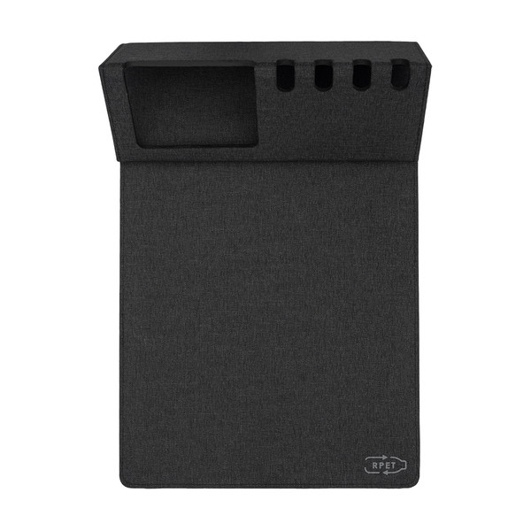 Foldable mouse pad made of RPET. It has a mobile phone stand and holders for four pens.
