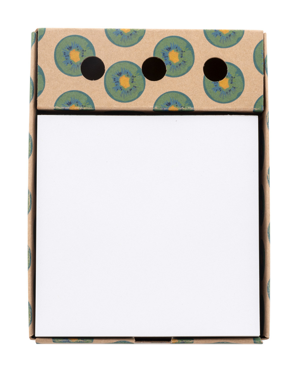 Custom made, kraft paper pen holder and note dispenser with 300 sheets memo block in recycled paper (90×90 mm). Price includes full colour printing on the holder. MOQ: 100 pcs.