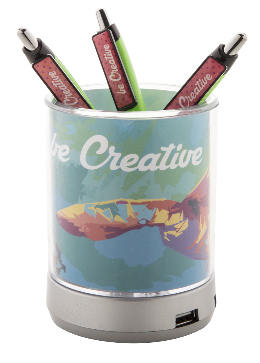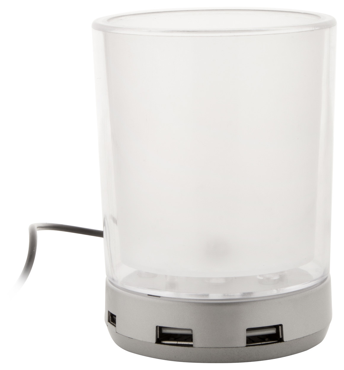 Desktop pen holder with 4-port USB hub and blue light, USB 2.0., material: ABS. Custom printed graphics can be placed between the 2 walls.