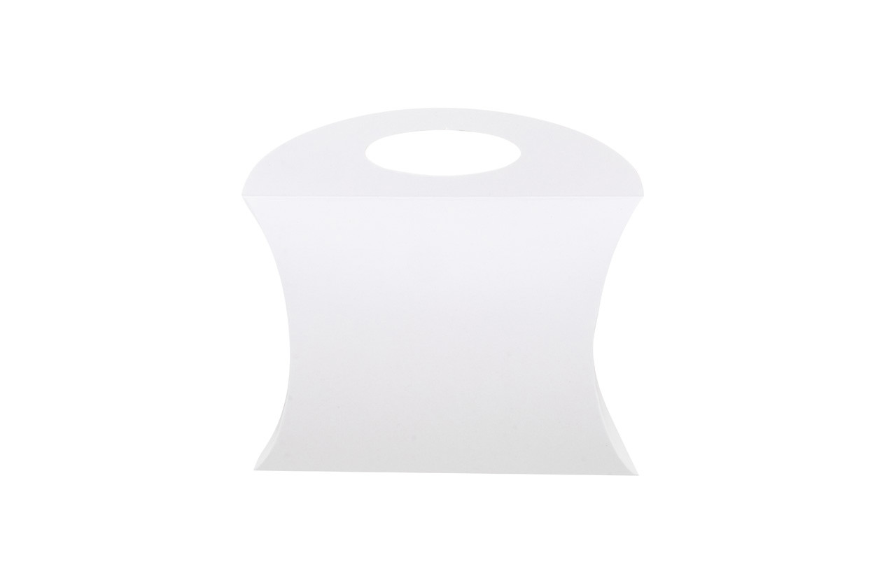 Custom made, full colour printed paperboard pillow box with handle. Delivered flat-packed. MOQ: 50 pcs.