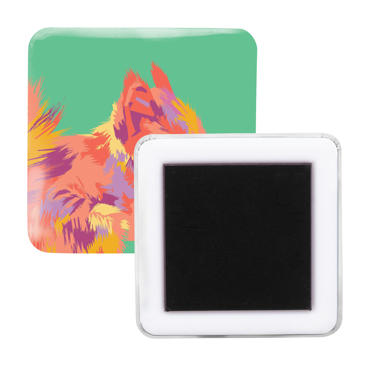 Square shaped pin button fridge magnet with custom full colour paper insert. Price includes digital printing. MOQ: 100 pcs.